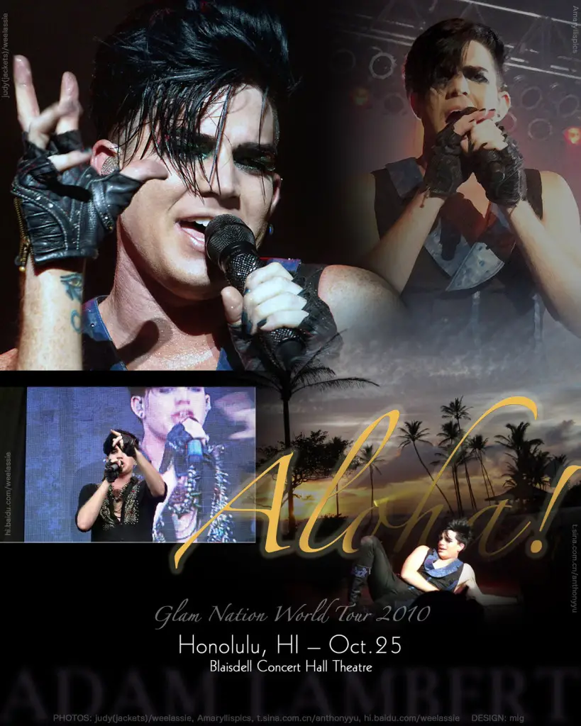 ALOHA! Adam Lambert brings his Glam Nation Tour to the Blaisdell Concert Hall Theatre in Honolulu. This is the first of two shows that will be played in Hawaii. The show starts at 8:00pm local time, 11:00pm PST, 2:00am EST (10/26/10). The venue holds 2.158 and is sold out.