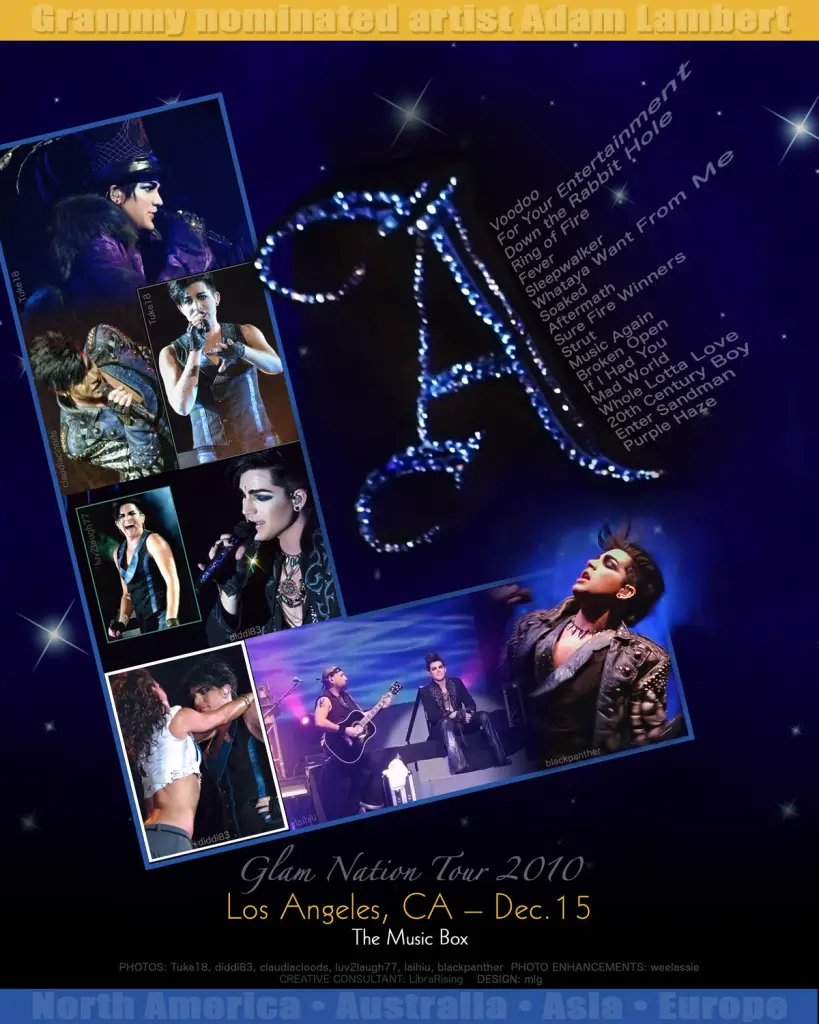 Adam Lambert and his crew are back to play their 2nd to last Glam Nation show at The Music Box in LA. Such a special night since Adam made his Zodiac Show debut at The Music Box December 15, 2004 exactly 6 years ago. Adam tweeted: