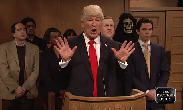 In the skit, Spicer declares that Trump will take his losing case with the 9th Circuit Appeals court to The Peoples Court. And sure enough, the one skit in which Baldwin plays Trump, he faces off against the three judges that shut him down. Hilarious.