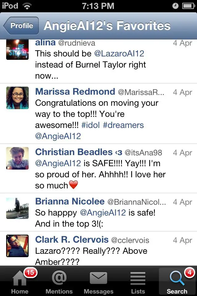 Angie also favorited this tweet, from @CarolG1346 23h “@LazaroAI12 stole @BurnellAI12 spot!! Done watching #idol! Hope @AngieAI12 wins. #lazaroneedstogo”