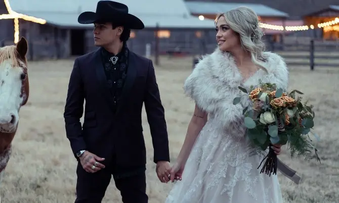 opted for a tuxedo from Jos. A. Bank, which he helped design with pal Zacharias Matthews, paired with boots from Dustin Bowen at Lucchese. As an extra special touch, underneath his cowboy hat, the groom, 27, carried some meaningful memento.