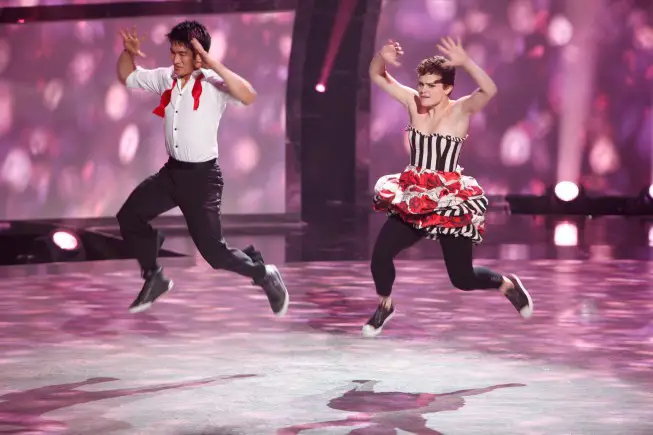 Next, the Top 11 joined forces to sing the group’s finale medley, and finally, Pia Toscano performed her single, “This Time”. Unfortunately for Pia, having the pimp spot meant getting cut off midway through her song. Oops.