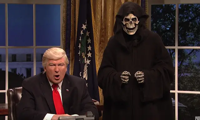 Alec Baldwin returning as Donald Trump is no doubt a warm-up for next week when the actor hosts SNL for the 17th time. This week, Alec and the gang mock Trump’s disturbing phone calls with leaders from US allies Mexico and Australia. In the bit, Bannon is introduced as literally the grim reaper, egging on Trump’s worst impulses. But when the president calls an African dictator…the tables are turned. Ha. The skit ends with Bannon relegating Trump to a desk that matches the size of his tiny, tiny hands.