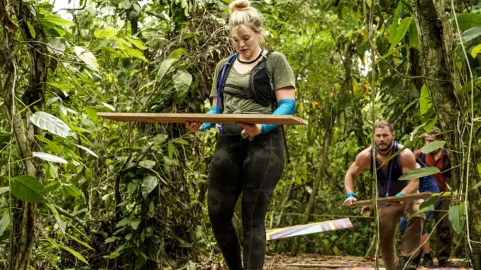 Host Mauro explains the rules of today’s adventure. The two teams must untangle ropes out of a log and then spool the rope. Next, they must navigate natural and manmade obstacles in the jungle while carrying a pole. Once they reach a lagoon, one team member must claim a flag out in the water. Lastly, they must complete a puzzle on a bridge. The first team to complete the puzzle and cross the bridge will win $35,000 to split among them. The challenge begins, and it’s fairly even. The Red Team complete the first stage first, putting them in the lead. The Blue Team is close behind them though.