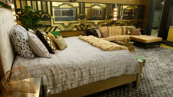 Upstairs, the Head of Household suite is pure Greed, sporting gold walls, gold floors, gold bricks and gold side tables. Real safety deposit boxes make up one wall of the room that is divided by an aquarium stocked with tropical fish. Also, the HOH bathroom features a 6-foot tall art deco chandelier.