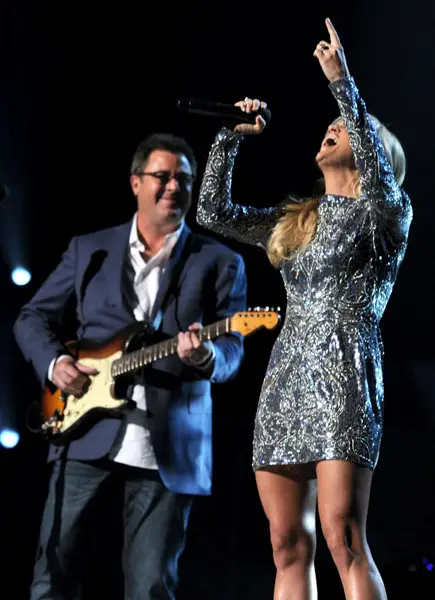 Gill took to the stage to honor Carrie with a version of her hit song, “Jesus Take the Wheel”. Gill then joined a tearful Carrie to accompany her on guitar as she sang the powerful hymn, “How Great Thou Art”.