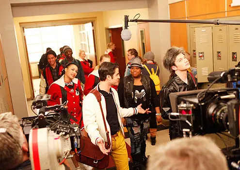 Glee cast filmed scenes at Dalton Academy. Lea Michele tweeted, “Morning! Rachel’s first visit to Dalton today! So excited to see all the #Warblers and watch them sing and dance! Via a photo tweeted by Naya Rivera—Kevin McHale, Darren Criss, Chris Colfer (in the background) are shooting there too Cory Monteith was also spotted at the shoot. Lea tweeted that she watched Grant Gustin sing and that he was “amazing”. (Dec 14) (These scenes were probably cut, along with “I Want You Back”)
