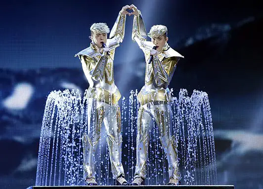 X Factor UK alums, John and Edward Grimes, better known as Jedward, represented Ireland in the first semifinal tonight. 18 countries competed for 10 places in Saturday’s final. Jedward had the pimp spot – they performed last and Ireland was also the last finalist announced.