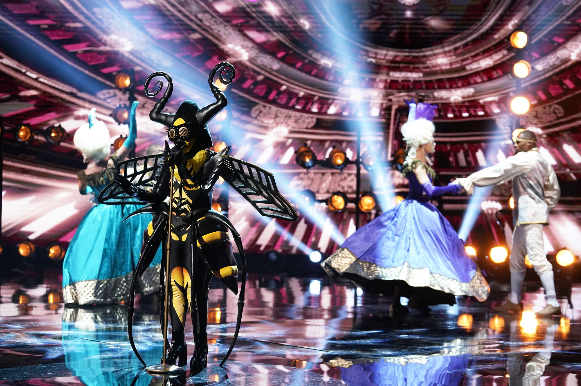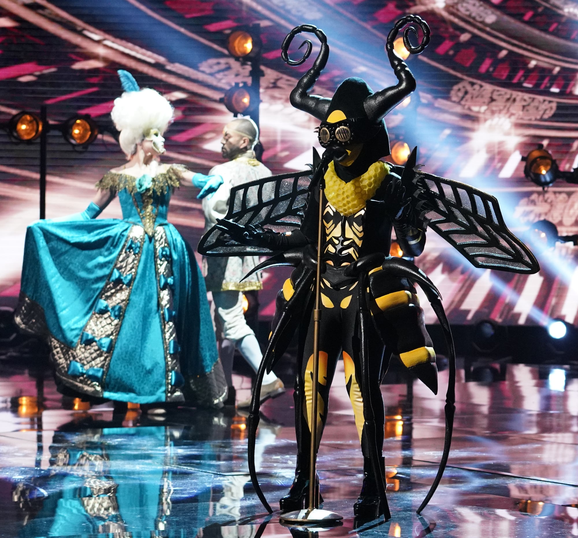 The Bee – “Being part of a show like this, I’m really having lots of fun. It gives me a challenge because I usually watch faces and they lift me up. But actually doing the mask part? I can’t see people! It’s kind of scary. Cause I’m singing the music of today. I’m not always on what’s happening in the world today musically. But it doesn’t matter how many awards you have. You have to be willing to flip the script.” Video clues: A peach breaks in half in the background, along with a cascade of honey. Bee cuts up with two of her bodyguards–they could be background singers!