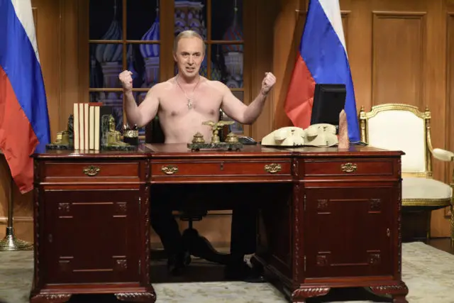 But I’ll take Beck Bennett as Russian President Vladimir Putin chiding his BFF Trump for a rocky first couple of days, while handing out a few propaganda tips to the newbie. Kate McKinnon plays a Russian woman who sings Putin’s praises from a script but then sneaks up behind him…Oh I won’t spoil it! Just watch it here.