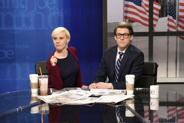 Joe Scarborough (Alex Moffat) and Mika Brzezinski (Kate McKinnon) speak with John Miller (Alec Baldwin), a spokesman for President Donald Trump, about the AHCA.