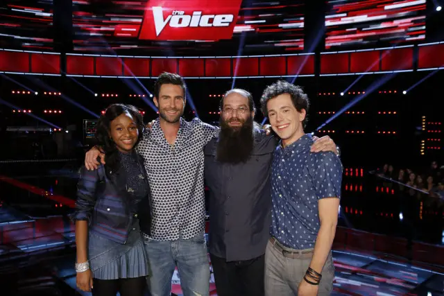 Pictured: (l-r) Shalyah Fearing, Adam Levine, Laith Al-Saadi, Owen Danoff — (Photo by: Trae Patton/NBC)