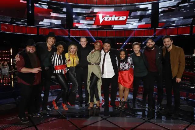 THE VOICE 11 Top 11 – Pictured: (l-r) Sundance Head, Austin Allsup, Courtney Harrell, Darby Walker, Aaron Gibson, Ali Caldwell, Christian Cuevas,We McDonald, Billy Gilman, Josh Gallagher, Brendan Fletcher — (Photo by: Trae Patton/NBC)
