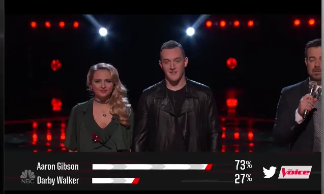 Once again Aaron is killing the vote 75% to 25%. Darby eventually creeps up to 27%. Miley’s tactic of reaming out America for not voting for Aaron worked. But then, it’s not as if America was buying Darby’s second-coming-of Miley deal anyway. Maybe the two should have spent more time working on the vocals and less on making weird hippie fashion statements.