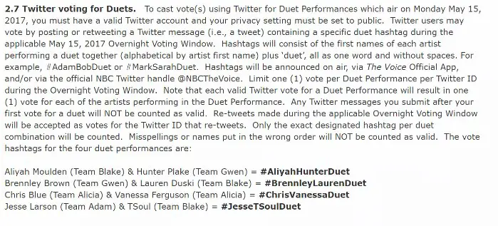 If that’s not enough damage for ya, there’s a new twist. For the first time ever, the artists team up for “competitive duets.” and according to NBC Vote rules, favorite duets can only be voted on via twitter hashtage during the overnight voting window: