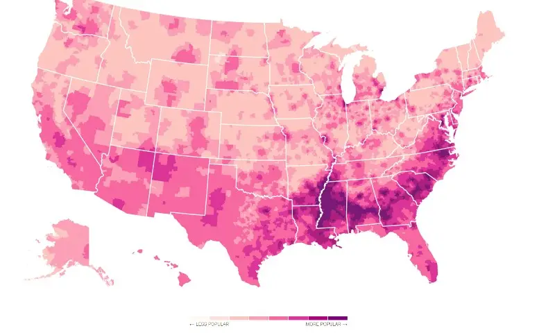 4. The Voice, a singing competition, is most popular in North Dakota and least popular in New York. It was behind only Duck Dynasty and Fast N’ Loud in its correlation with Trump voters.