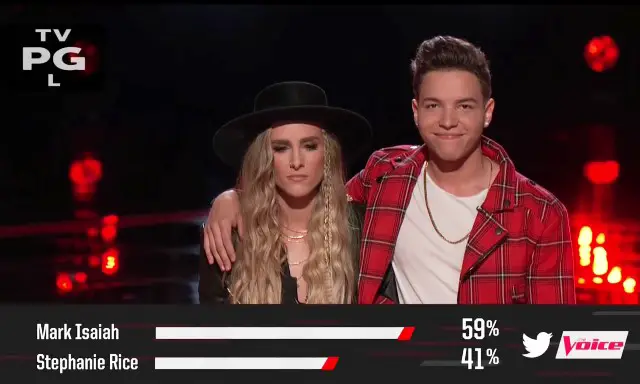 Ok guys you have five minutes. Tweet #VoiceSaveStephanie or #VoiceSaveMark! During commercials: It’s Mark 60% and Stephanie 40%. BYE STEPHANIE. Dang. Her performance last night was one of my favorites. I dug her switch up to rock. Oooh. Alicia is basically giving Stephanie a “goodbye” speech. Adam is a lot more hopeful speaking to Mark “I’m going to fight tooth and nail for you bro,” he says.