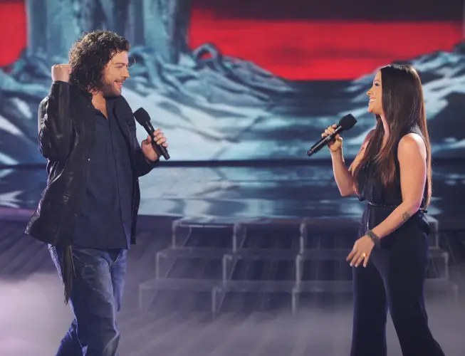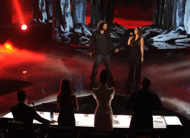 Josh Krajcik and Alanis Morissette – “Uninvited” – Nicole’s Over 30s – Josh gets off to a pitchy start. The minor key is tough. Josh introduces Alanis. She’s hitting the notes beautifully. Why have the contestants sing with music stars that overwhelm during the competition? This performance is obviously not well rehearsed. It’s kind of a trainwreck–Josh is having trouble staying in key throughout. The duets would have been better in a more relaxed setting–like the finale. Alanis says Josh is a “deeply soulful man.” LA: That was surreal. That was such a natural pairing. You seemed right at home. That was great. Paula: I couldn’t think of a better way to open. You held your own and kept your identity. Good luck to you. Simon: We got to judge this. Alanis is amazing. I thought you were a little bit intimidated at the beginning. As the song got into gear, I heard the old Josh back. An 8 out of 10. (Josh admits he might have been a little intimidated). Nicole: You are giving and wonderful as an artist. – 1-855-843-9301 Text vote to 9301