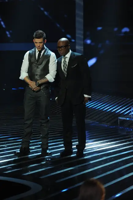 The Final 3 take the stage with their mentors. Steve gets right down to business. In 3rd place is Chris Rene. Hey Chris. Don’t drink and/or drug over it, OK? Oddly, there’s no goodbye package for Chris. Steve shoos Chris off the stage (Awkwardly) and then tries to keep Simon from walking off the stage (Awkwardly), but I guess he needs a cig. And he’s the boss!. Josh and Nicole are left on center stage (Awkwardly) as Steve goes to break. Did I say…Awkward?